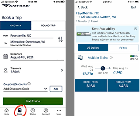 In order to figure out how many segments you would need to travel between two destinations, you can download the Amtrak app, click the “Book” icon at the bottom of the screen, and type in your departure and arrival cities, as well as the date you want to travel. You can see that the search results below on the right indicate that you would have to take multiple trains between Fayetteville and Milwaukee, and the solid blue circle indicates the exact number of trains: in this case, 3–for a total of 3 segments. Please note that you can get the same information through the Amtrak website if you prefer websites to apps.