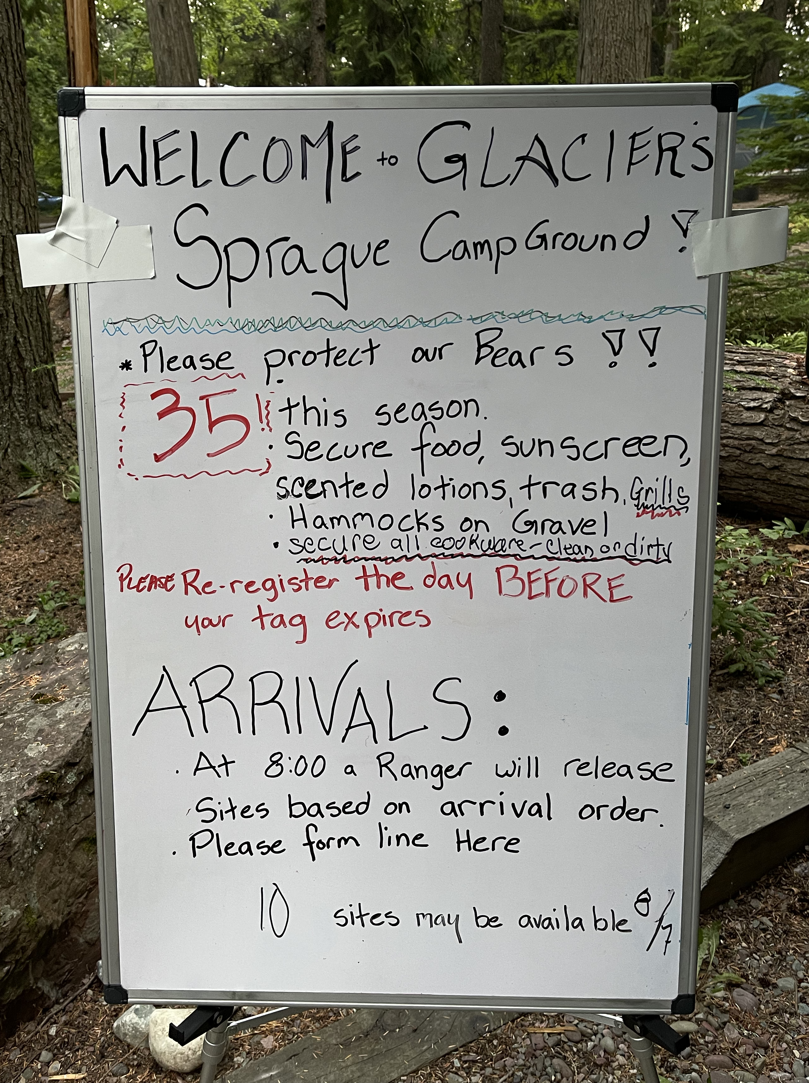 After some research, I found that Glacier has a pretty great shuttle system that travels along Going to the Sun Road. This year’s stops were more limited than usual, and some of the campgrounds were closed–I’m guessing due to staffing shortages stemming from the pandemic–but it appeared to be possible to get around the park without a car. Further complicating matters was the fact that people were flocking to the park in record-setting numbers, and all of the accommodations that could be booked were. Still, I’d read that some of the campgrounds operated on a first come/first served basis, so I figured we would be able to find a place to pitch a tent.